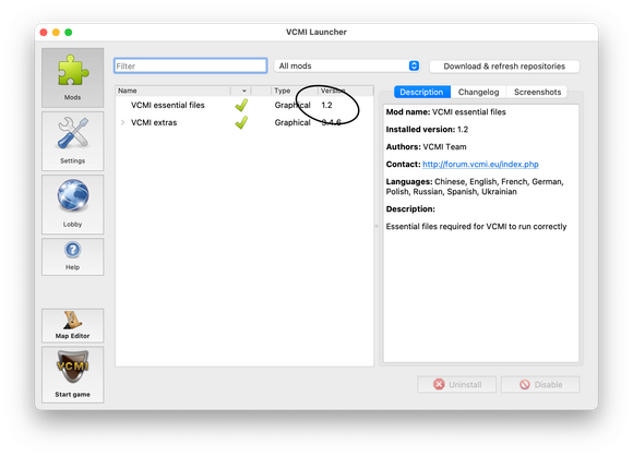 Die Lösung war unter ~/Library/Application Support/vcmi im Mods-Ordner die alte Erweiterung zu löschen. Nach einem Neustart von VCMI wurden die Essential Files auch korrekt als Version 1.2 angezeigt!